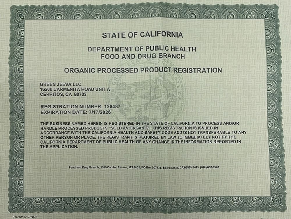 At Green Jeeva, we are proud to hold the CDPH (California Department of Public Health) Certificate issued by the Food and Drug Branch (FDB). This certification reflects our commitment to meeting the regulations and requirements of the CDPH, ensuring the safety and quality of our products.