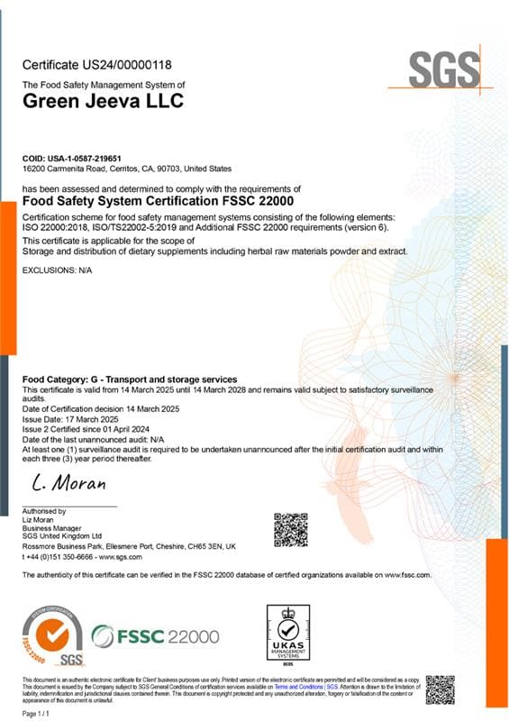 Our FSSC 22000 certification surpasses even organic standards, guaranteeing the industry's most stringent food safety and hygiene practices throughout our entire operation. This ensures you receive the trusted, certified organic ingredients you rely on with an additional layer of confidence. Green Jeeva is dedicated to exceeding expectations, providing a seamless experience, and being your most reliable source for premium organic ingredients.