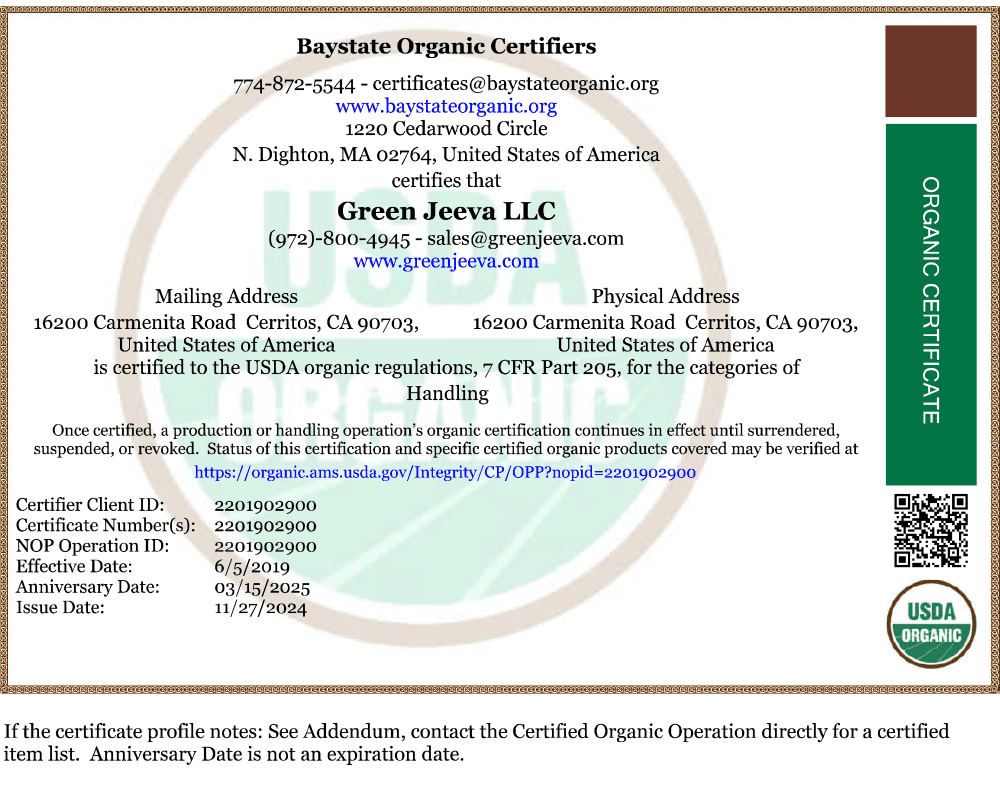 At Green Jeeva, we are proud to hold the Organic Certificate issued by Baystate Organic Certifiers. This esteemed certification is a testament to our unwavering commitment to providing our customers with high-quality organic ingredients.