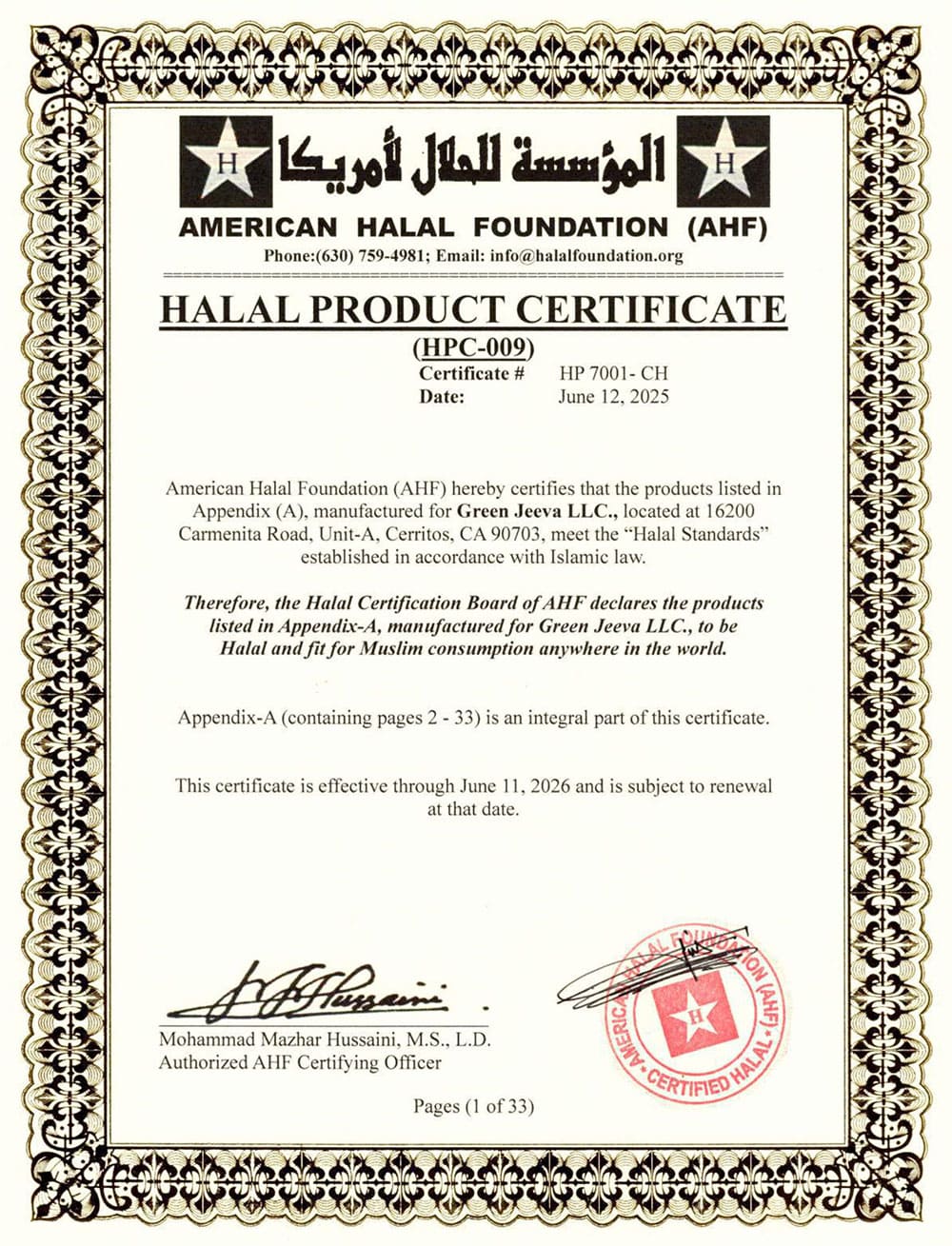 At Green Jeeva, we are delighted to hold the Halal Certificate issued by the American Halal Foundation (AHF). This esteemed certification reflects our strong commitment to providing our customers with Halal-certified ingredients of the highest quality.