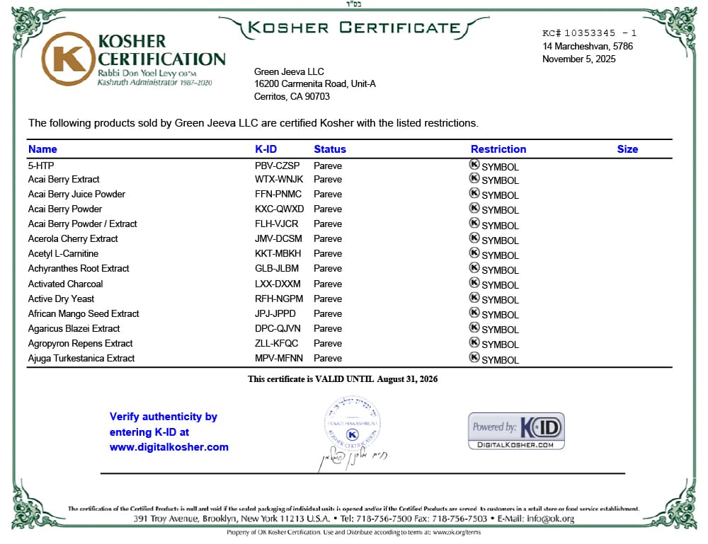 At Green Jeeva, we are proud to hold the Kosher Certificate issued by OK Kosher Certification. This esteemed certification is a testament to our commitment to providing our customers with kosher-certified ingredients of the highest quality.