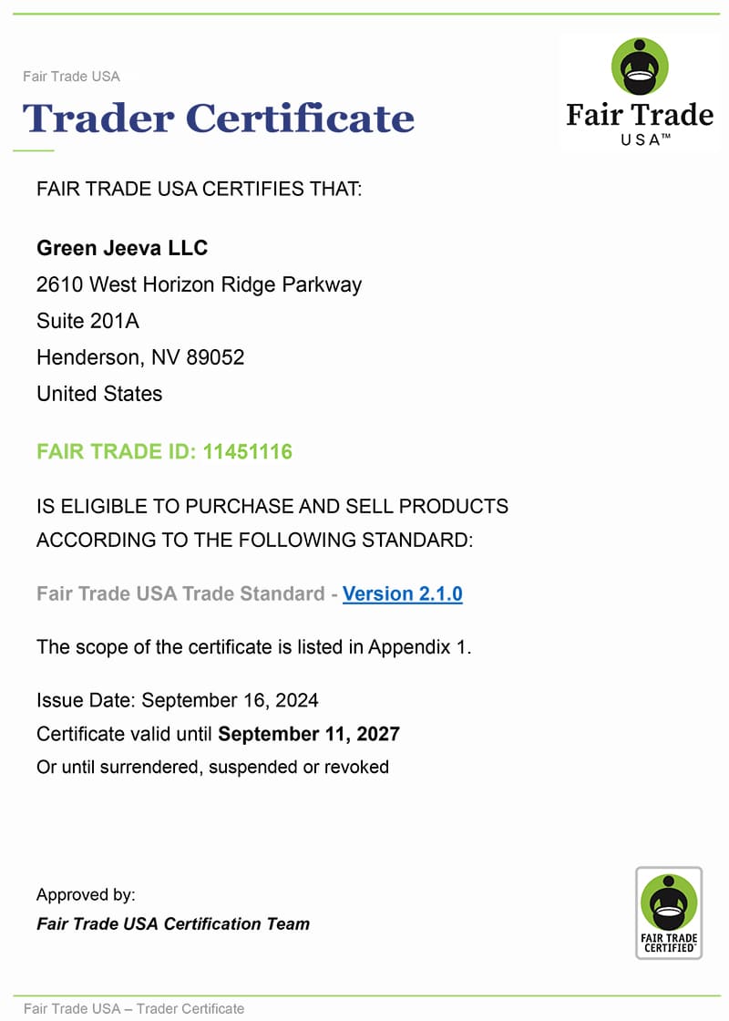 Green Jeeva is proud to hold the Fairtrade Certificate, awarded by FLOCERT, a globally recognized certification body. This certification underscores our unwavering commitment to ethical sourcing, social responsibility, and empowering farming communities around the world.
