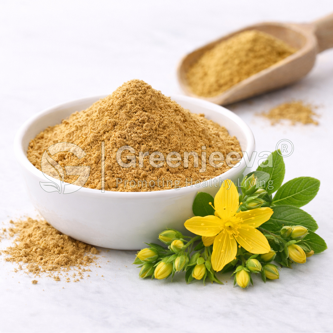 Organic St. John’s Wort Herb Powder is made by drying and grinding the aerial parts of the St. John’s Wort plant. It contains natural flavonoids, hypericins, and pigments that contribute to its yellow-green color and characteristic herbal flavor. The powder is used in beverages, dietary supplements, herbal formulations, and functional foods for its natural color, taste, and texture.