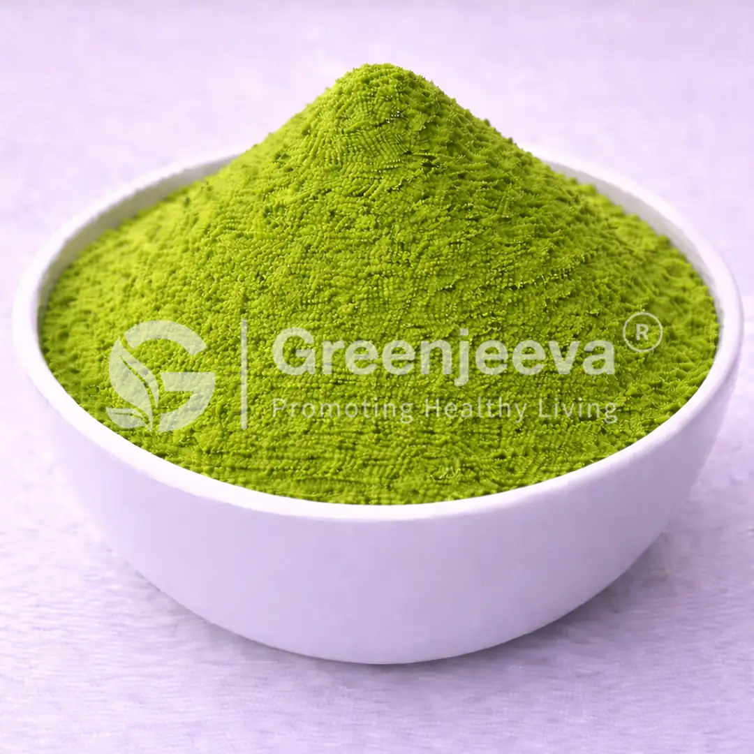Green Jeeva’s Organic Wheat Grass Juice Powder is produced from the young leaves of Triticum aestivum, carefully harvested at peak growth stage from certified organic farms in regions such as the USA and India. The fresh wheatgrass is juiced, gently dried, and finely milled to preserve its natural green color and botanical composition.